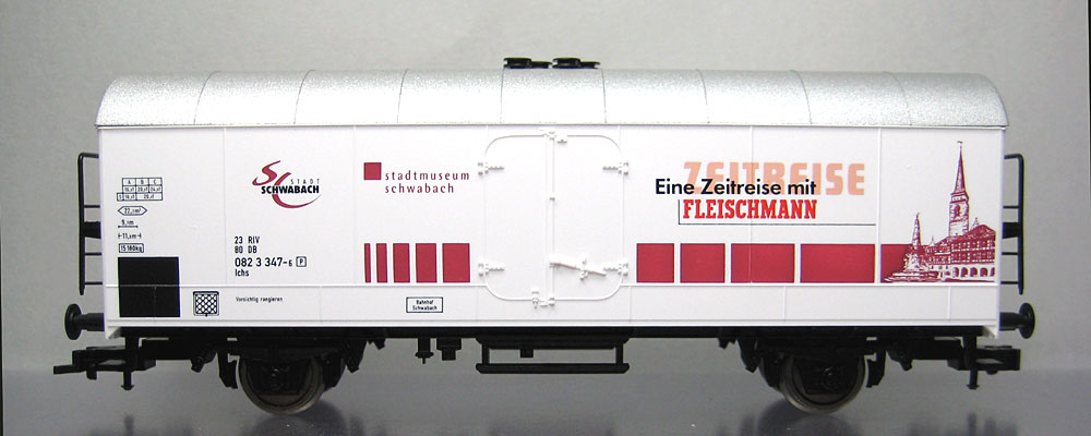 Kühlwagen Ichs der DB Betr.-Nr. 082 3 347-6 mit Beschriftung: "Eine Zeitreise mit Fleischmann".