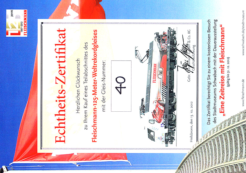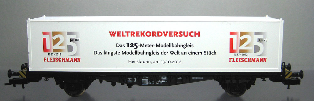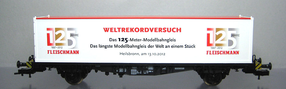 verschenkt/verkauft wurde. Als Nachweis wurde ein Zertifikat beigefügt. Das mir vorliegende Gleisstück hat eine Länge von ca. 60 cm. Legt man diese Länge zugrunde, dann dürften ca. 200 Gleisstücke hergestellt worden sein. Weiter gab es zu diesem Anlass einen 40´ Container mit rotem Dach. Vereinzelt wurden auch Wagen mit weißem Dach verkauft. Der Tragwagen wurde privat hinzugefügt. |
