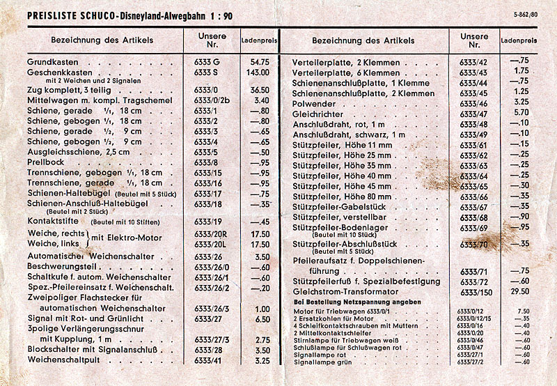 The Schuco-Disneyland-Alweg-Monorail is a D/C model train. It can operated with every D/C transformer from 14-17 Volts.